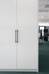 W ramach realizacji dostarczyliśmy i zamontowaliśmy kompletne wyposażenie biura, obejmujące zarówno meble biurowe na wymiar, jak i elementy dekoracyjne oraz akustyczne: