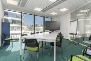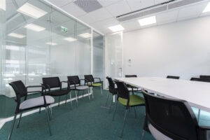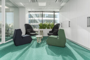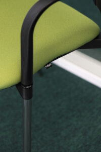 Krzesła konferencyjne z tapicerowanymi siedziskami w odcieniach zielonym, szarym i czarnym – dopasowane do kolorystyki marki.