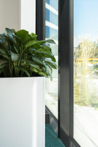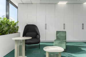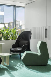 Dominująca kolorystyka – biel, zieleń i czerń – podkreśla nowoczesny charakter biura, jednocześnie nawiązując do ekologicznego profilu firmy. Wprowadzone rośliny i panele akustyczne nie tylko poprawiają estetykę, ale też wpływają korzystnie na samopoczucie i koncentrację pracowników.