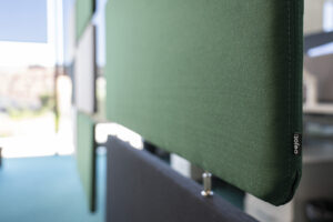 Zestaw podwieszanych paneli akustycznych w kolorach zielonym, czarnym i szarym – poprawiających akustykę i wprowadzających wizualną lekkość.