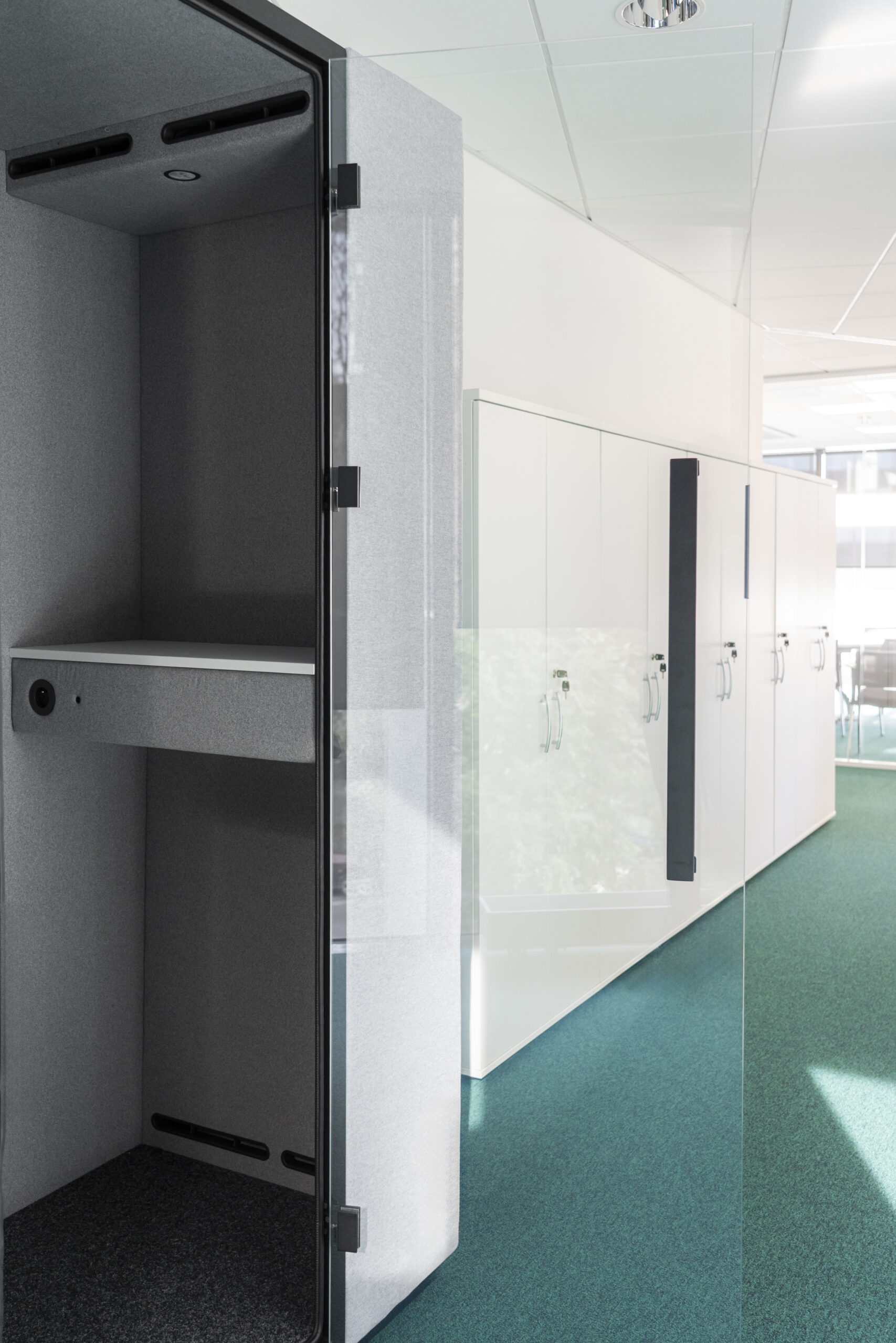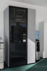 Kabina akustyczna – z zewnętrzną powłoką w kolorze jasnoszarym i kontrastującym wnętrzem w tonacji jasnoszaro-ciemnoszarej, zapewniająca prywatność i komfort akustyczny.